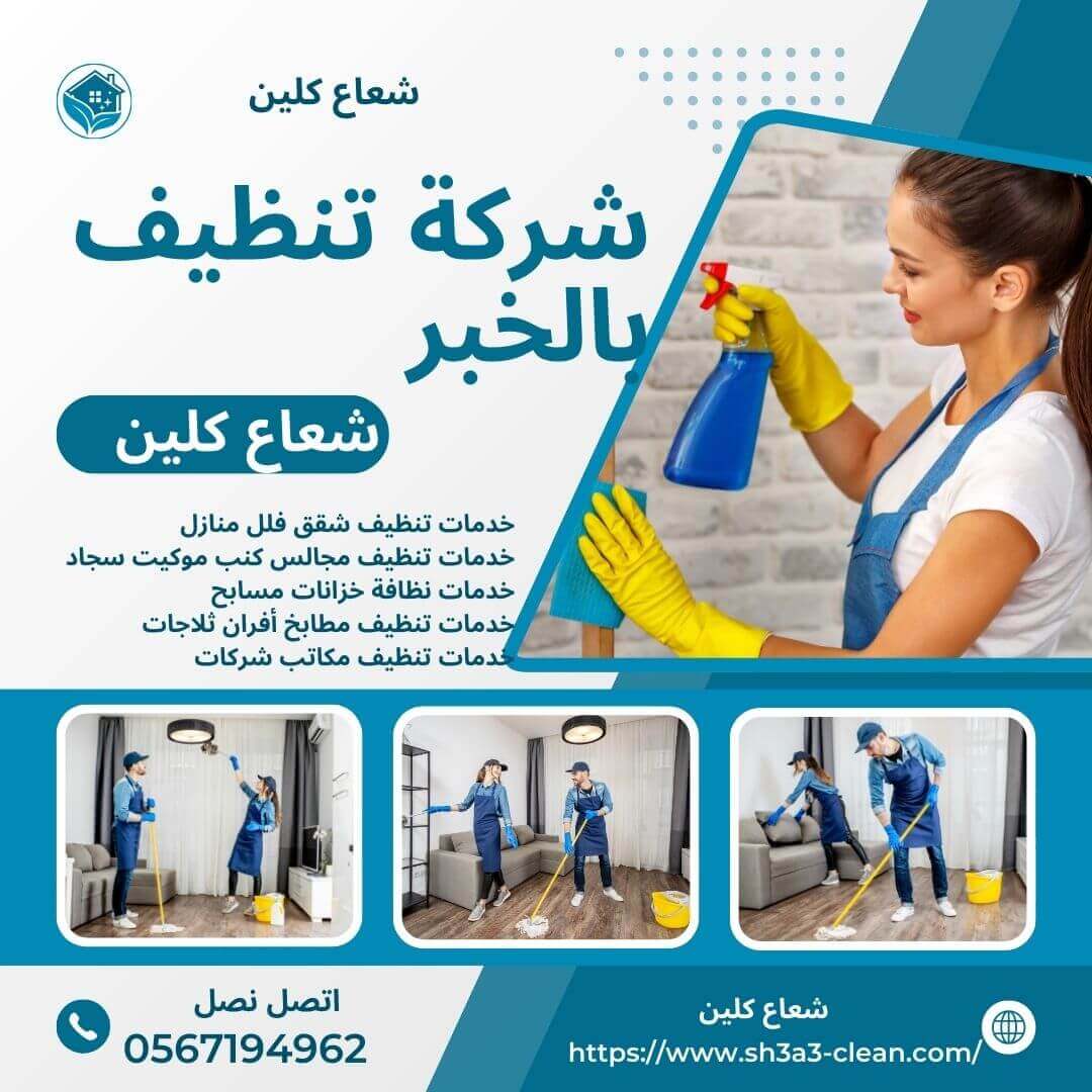 شعاع كلين من الشركات التي تقدم خدمات تنظيف فى جميع المنطقة الشرقية وخاصة مدينة الخبر، ولكى تقوم بعمل النظافة بشكل صحيح حتى يضمنوا في الوقت المناسب. يمكنك منح هؤلاء عمال النظافة موعدًا نهائيًا ، وسوف يتأكدون من اكتمال العمل في الوقت الذي يحدده عميلهم،