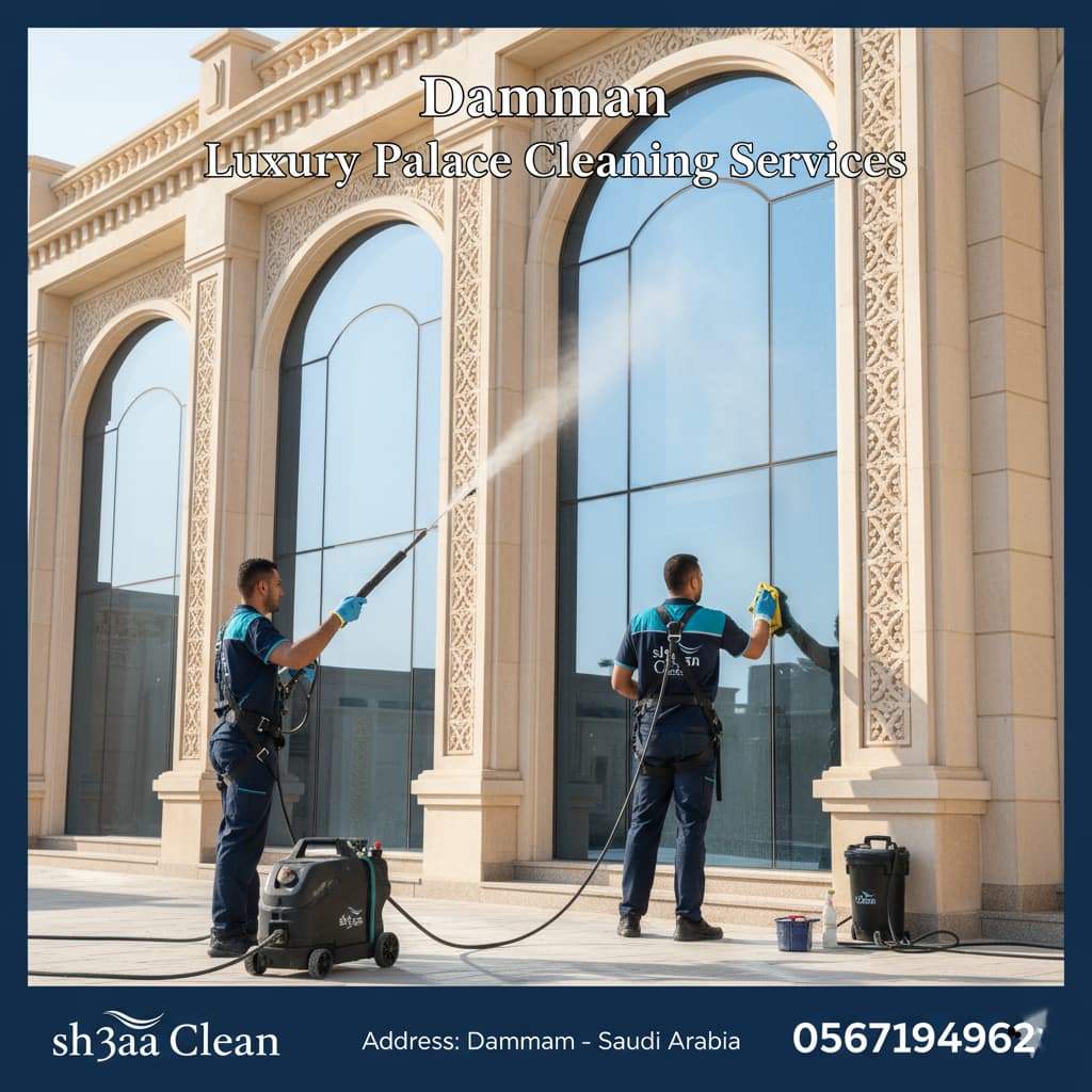 - فريق عمل مدرّب له خبرة في التعامل مع الواجهات الزجاجية الحساسة، خاصة تلك الموجودة في القصور ذات التصاميم الدقيقة والمناطق المرتفعة أو الصعبة الوصول.